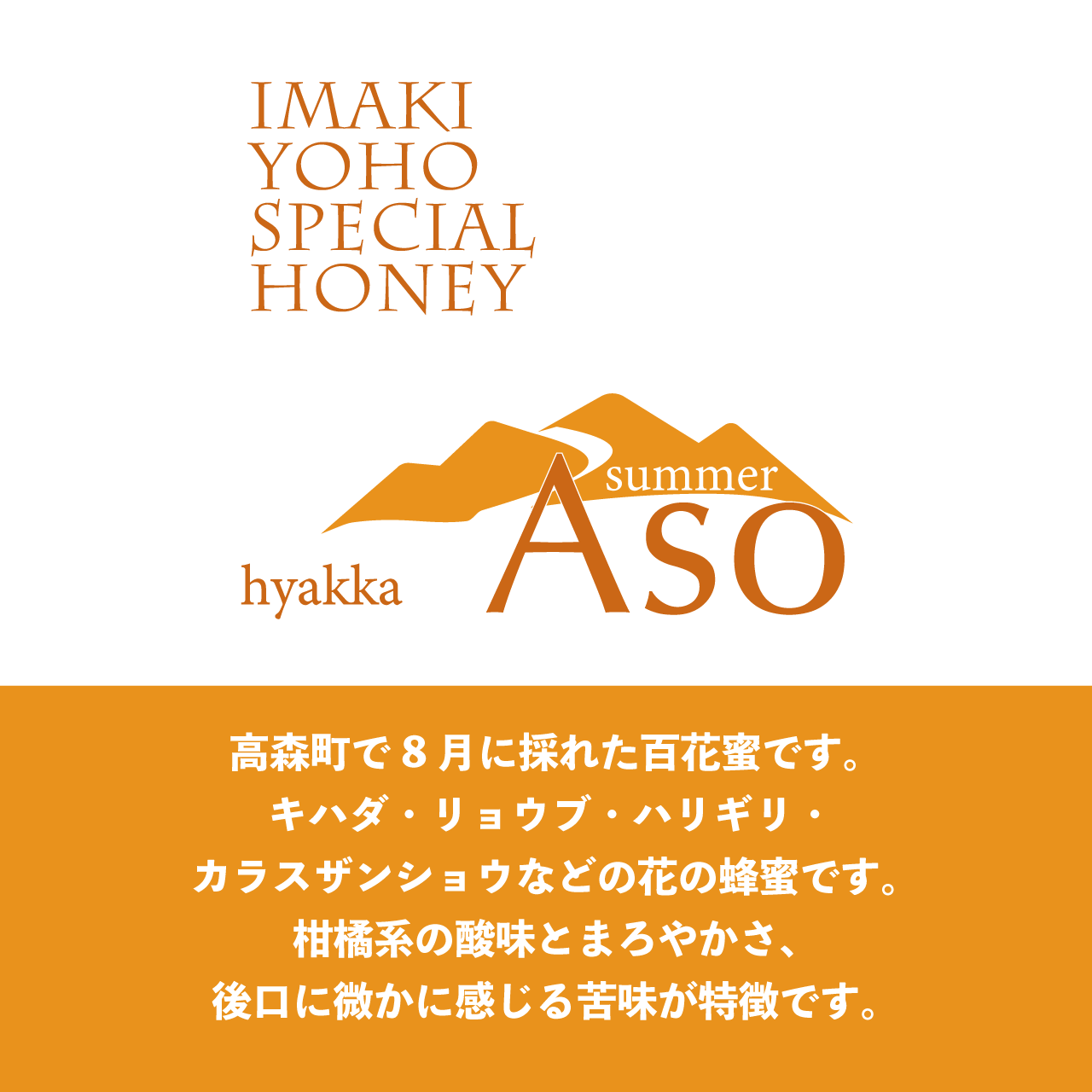 キハダ・リョウブ・シナノキ・ハリギリ・カラスザンショウなどの花が咲いている時に採れた百花蜜です。柑橘を想わせる上品な酸味とまろやかさ、後口に微かに感じる苦味が夏にぴったりです。ゆっくりと時間をかけて丁寧に採取し、昔ながらの製法で作られています。自然の甘さがたっぷりと詰まった、贅沢な一品です。